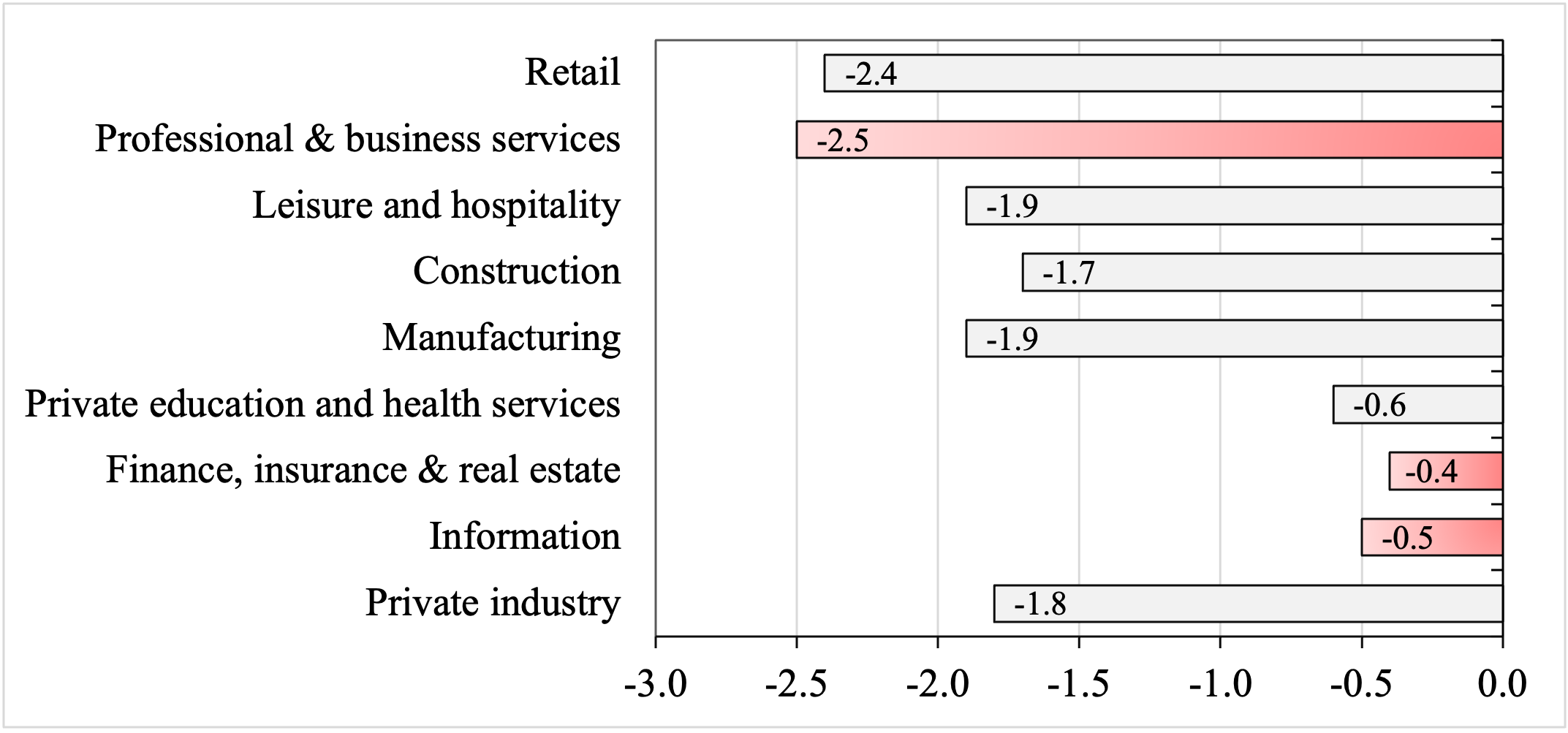 Figure 2 Hiring Rates in Major Industries (Percent Change during November 2021-February 2026 Source: FRED database, based on BLS data from the Job Opening and Labor Turnover Survey (JOLTS). Notes: The hiring rate is defined as the number of newly hired workers as a percentage of already employed workers in a month. The red bars indicate industries with the highest AI-exposure.